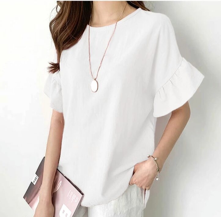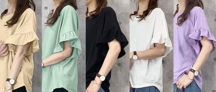 このトップスのポイントは、この形にありがちなレーヨンなどでは無く、綿100%のTシャツ生地なのに、フェミニンで女性らしいという点です。