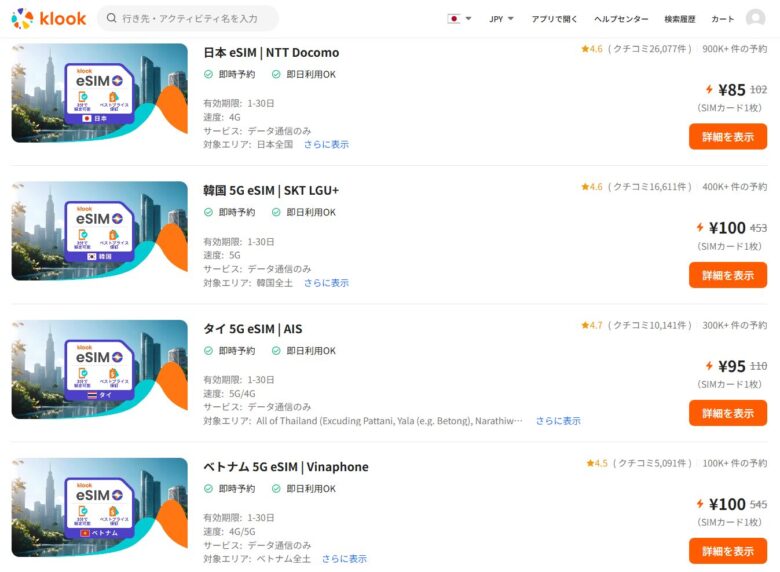 eSIMも豊富で、例えば「eSIM Japan | DOCOMO – Klook」では高速度通信・QRコード即時発行などをPRしています。