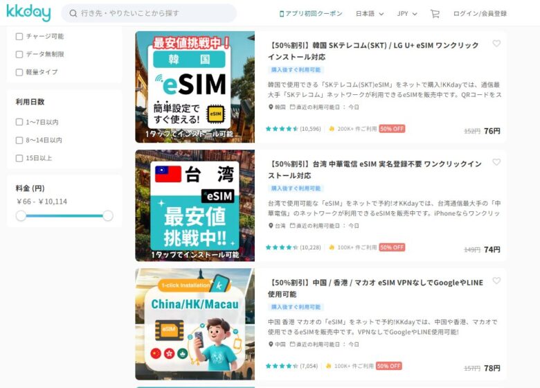 例えば、台湾や韓国、タイなど人気の渡航先では、KKday eSIMが通信速度のレビューも良く、価格もKlookの同等プランより安いケースが多く見られました。