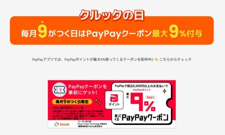 このキャンペーンは、Klookのクーポンと併用可能なため、9のつく日を狙い、Klookのクーポンを使用して最大限安く買うのが得策です。