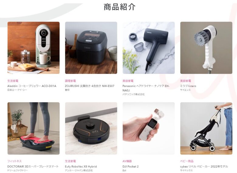 キッチン家電、お掃除家電、美容家電、フィットネス機器、おもちゃ、キャンプ用品など多様なカテゴリーが揃います。