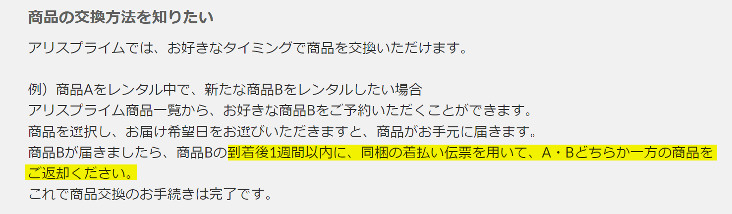 - 商品Bが届いてから1週間は商品AとBの両方を借りた状態にできる
