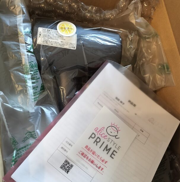 開けてみると、消毒済シールが張られた商品と、書類一式がこのように丁寧に入っていました。