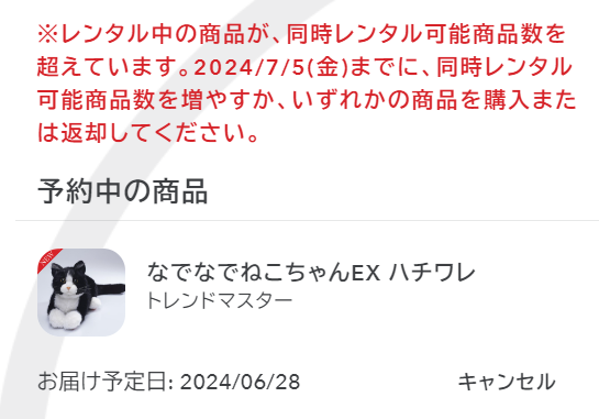 すると、下記の様に、商品Bのお届け予定日から1週間後の日にちまでに、同時レンタル可能数を増やすか、商品AかBを返却する様にという表示が出ます。