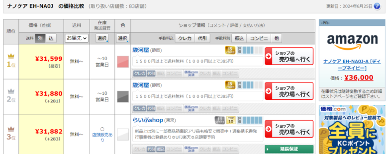 パナソニック ヘアドライヤーナノケアEH-NA0J ですが、アリスプライムでは43,120円、価格コムで新品が最安値31,599円、Amazonでも36,000円で販売されていました。
