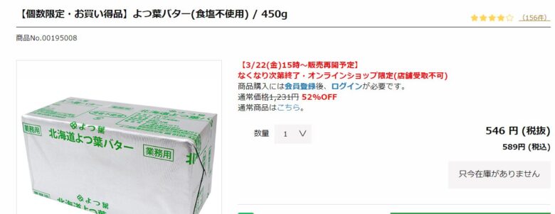 富澤商店は常時、1人一点のみ限定でよつ葉バターを通常の半額で販売しています。