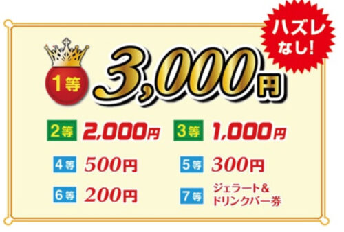 ハズレは無しで、一番下の7等でもジェラート&ドリンクバー券が当たります。