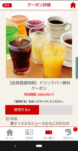 公式アプリのダウンロードで、初回ドリンクバー無料クーポンがもらえます。