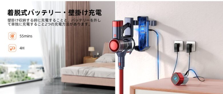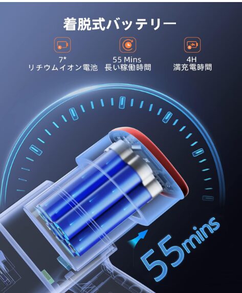 以前、他社のコードレス掃除機を使用していましたが吸引力が弱く「強」で使用すると7分で充電が切れていましたが、こちらの掃除機は4部屋掃除しても大丈夫でした。良い買い物が出来ました!引用元:楽天市場