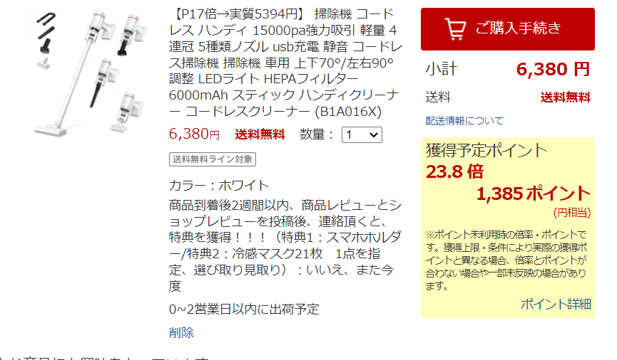 楽天で買うとポイント還元が+17倍で、私の場合1,385ポイントも付きました。
