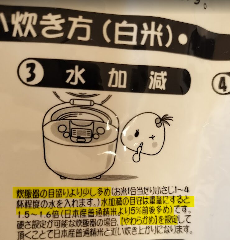 - 水加減は日本米より5%前後多めにする(いつもの1.2倍~1.5倍)