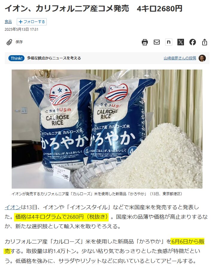 イオンが6月6日からカリフォルニア米を2,680円(税抜き)で販売を始めるそうです。