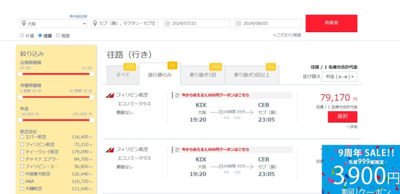 少し価格は上がりますが、フィリピン航空はLCCでは無い為、安心ですね。