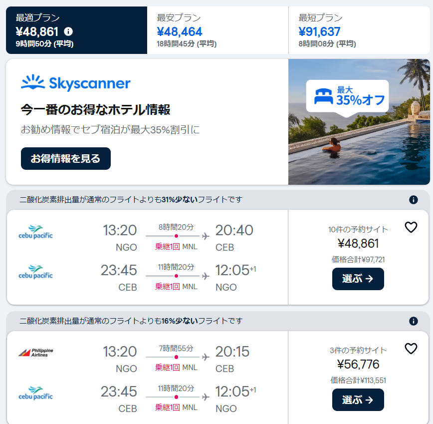 格安LCCの航空会社である、セブパシフィック航空が最も安く、乗り継ぎの待ち時間も短いのでおすすめです。