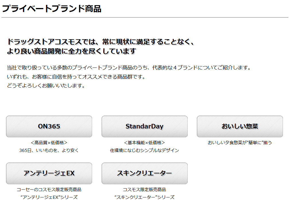| 日用品 | ティッシュ・洗剤 | コスモス独自ブランドが強い |