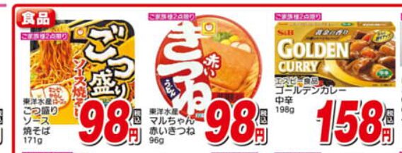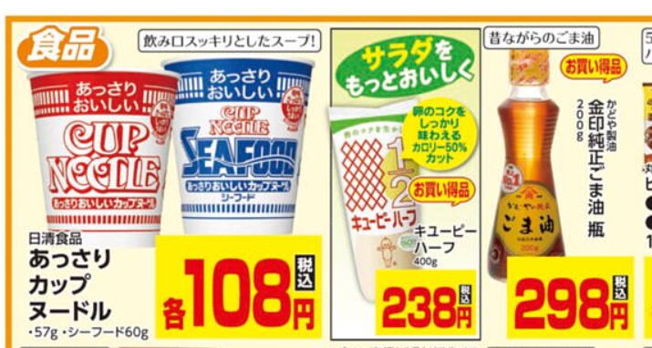 | 食品 | カップ麺・調味料・米菓 | スーパーより安いケース多数 |