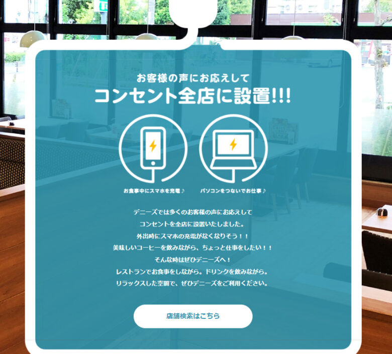 デニーズには全店コンセントがある!フリーWi-Fiもある