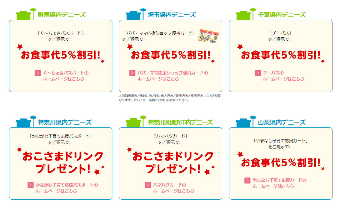 お住まいの自治体が対象かはこちらで確認できます→デニーズ子育て支援