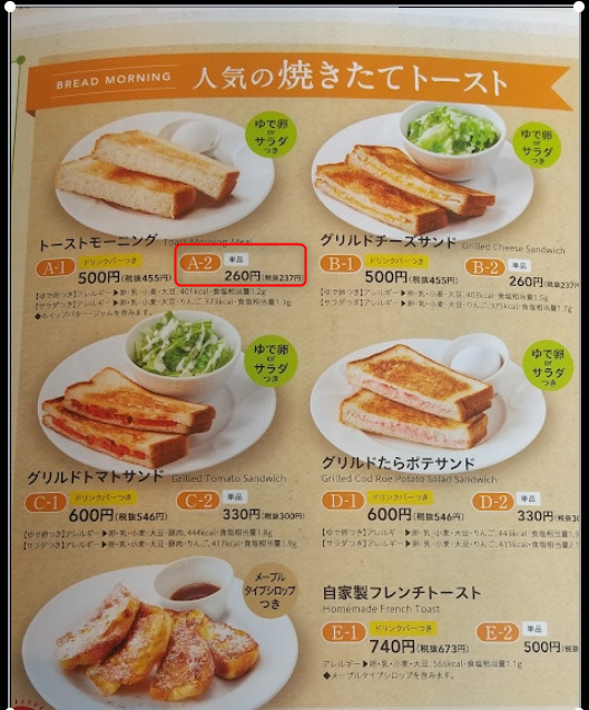 下はモーニングメニューですが、トーストモーニングの単品は260円となっています。