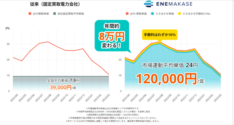 ほとんどの電力会社が固定買取型に対し、エネまかせは、市場価格(JEPX)に連動し、買取価格が決まる事が特徴。