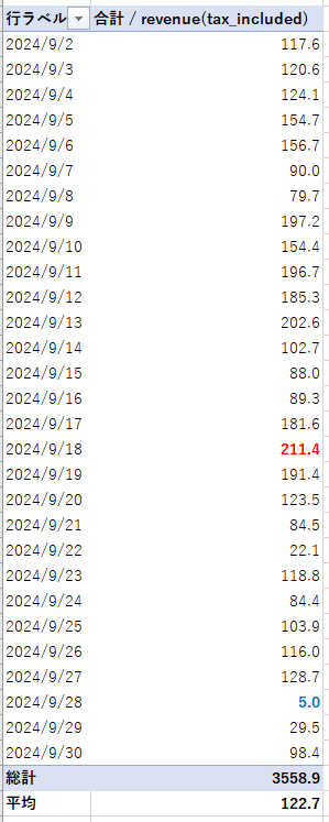 9月の約1か月(29日間)の収益は、3558.9円でした。