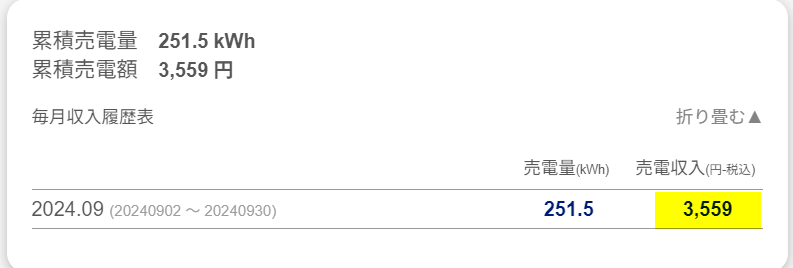 9月の累積売電額は、3,559円で確定しました。