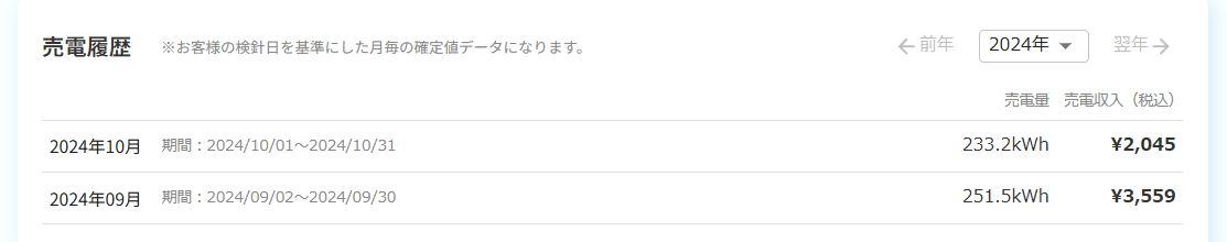 10月は売電量自体が少なかったこともあり、2,045円でした。