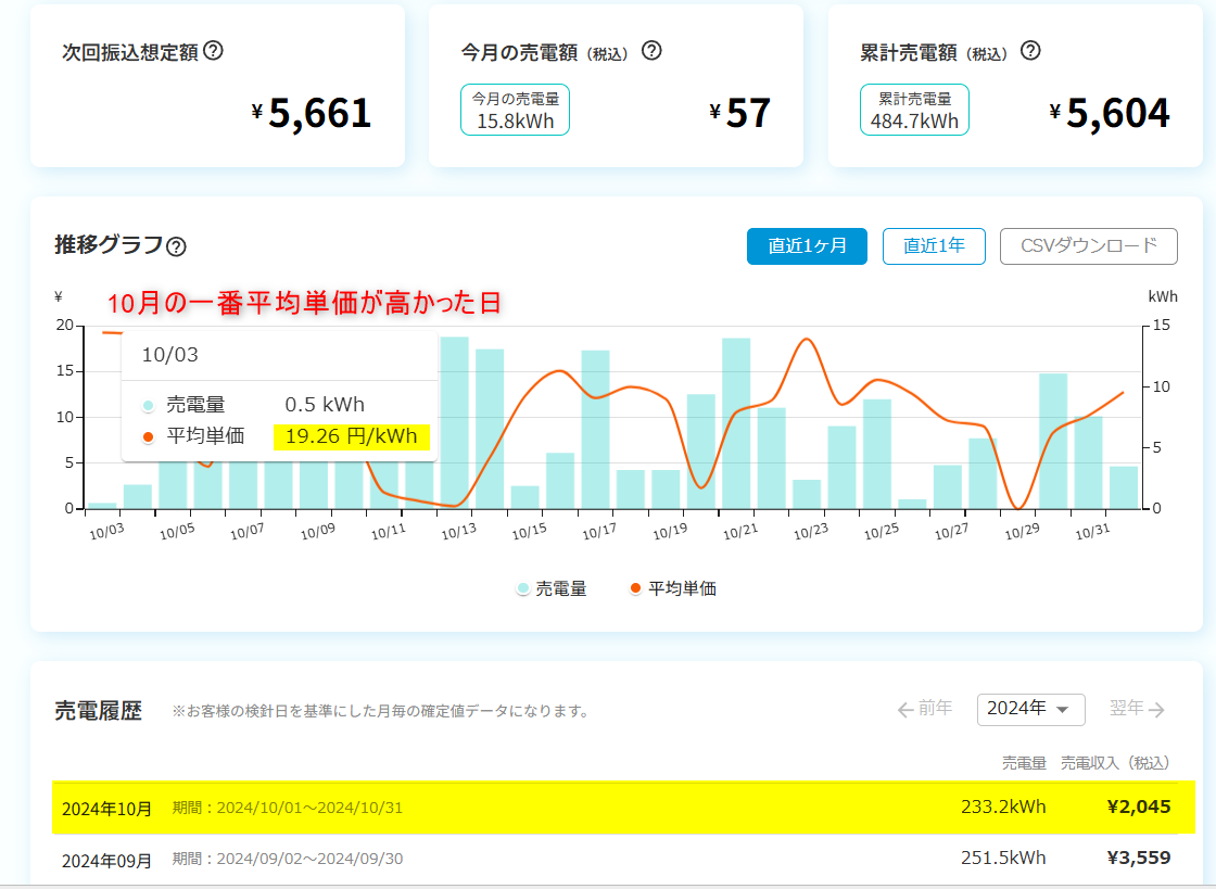 9月と10月で単価にかなり差が出ましたが、中電の8円よりは良いという結果になりました。