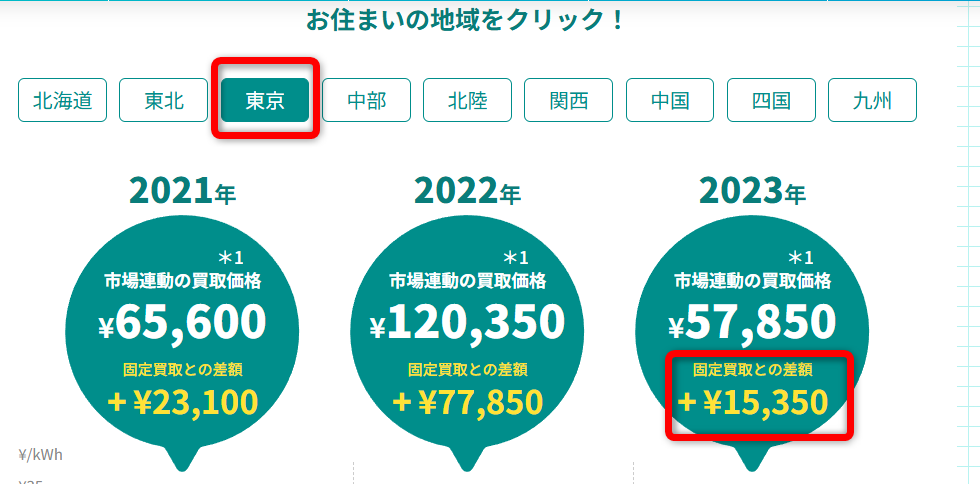 東京は全国で最も買取価格が高く、固定買取との差額が、15,350円プラスになっています。