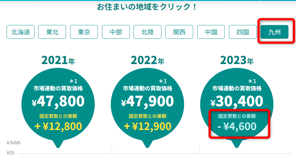 一方、九州の場合は、なんと固定買取よりも4,600円マイナスです。