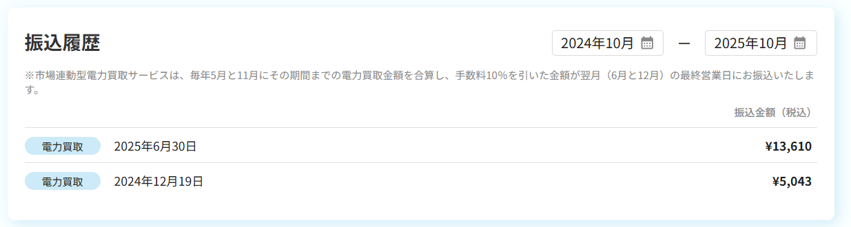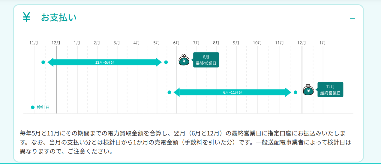毎年5月と11月にその期間までの電力買取金額を合算し、翌月(6月と12月)の最終営業日に指定口座に振り込みになります。