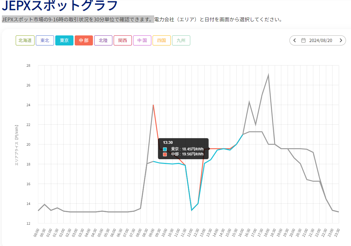下記で、JEPXスポット市場の9-16時の取引状況を30分単位で確認できます。