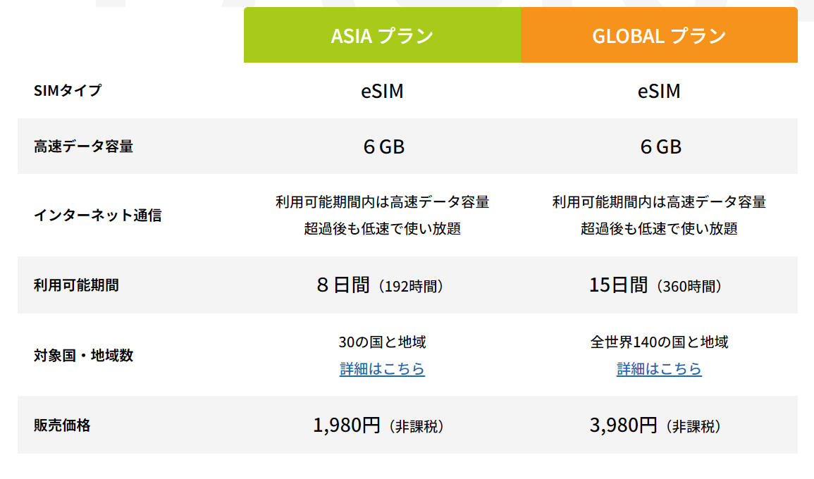 • 30ヶ国で使える「ASIAプラン」と、140ヶ国で使える「GLOBALプラン」の2種類のみで分かりやすい
