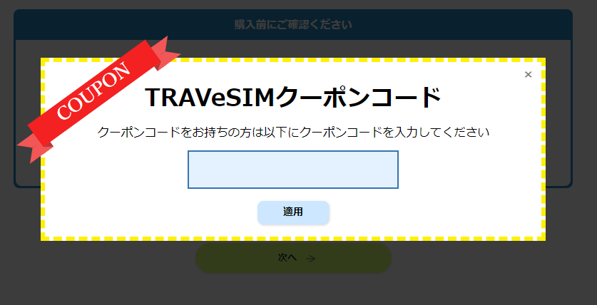 トラベシムの申し込みページに、クーポンコードの入力欄があります。