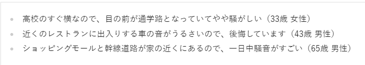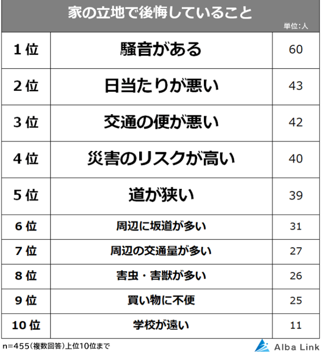 下記は、2023年に不動産業者Alba Link が、455名の住宅購入者からとった「家の立地で後悔していること」のアンケート結果です。