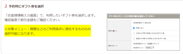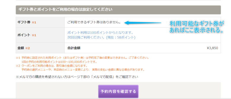 メニューや日程等を選択し、最後の申し込みで、ギフト券とポイントの利用を設定する箇所があります。