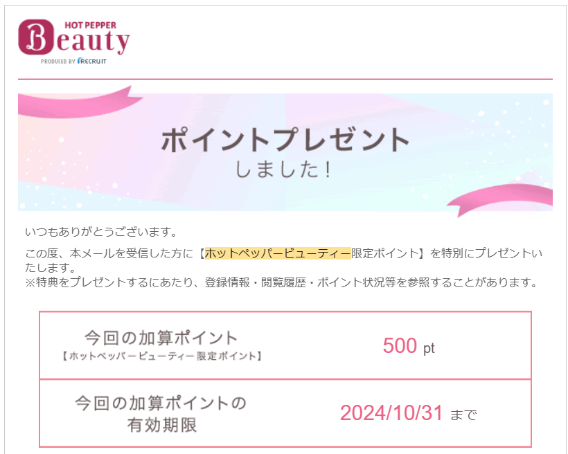 ホットペッパービューティーの500円~3,000円のギフト券のプレゼントが突然届くことがあります。