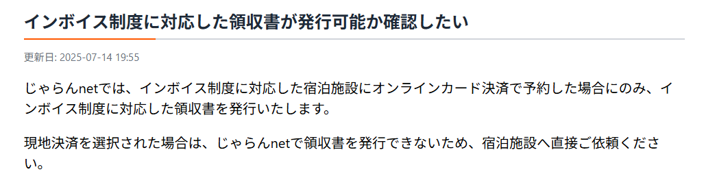 じゃらんでは、事前決済すれば、インボイス対応した領収書を発行可能です。
