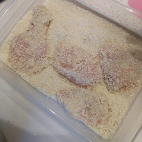 時短も兼ねて、バッター液と言われる水、薄力粉、卵を混ぜたものを付けた揚げる方式ですが、その卵を抜いています(笑)