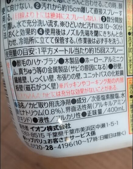確かに、私が使用したカビ取り用洗浄剤(トップバリュのもの)も上記とほぼ同じでした。