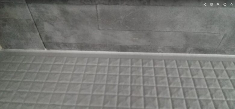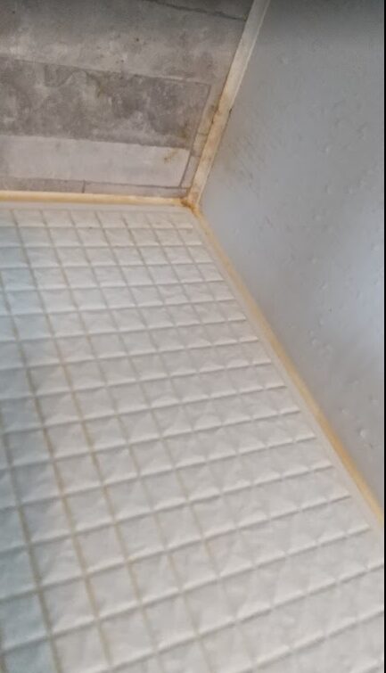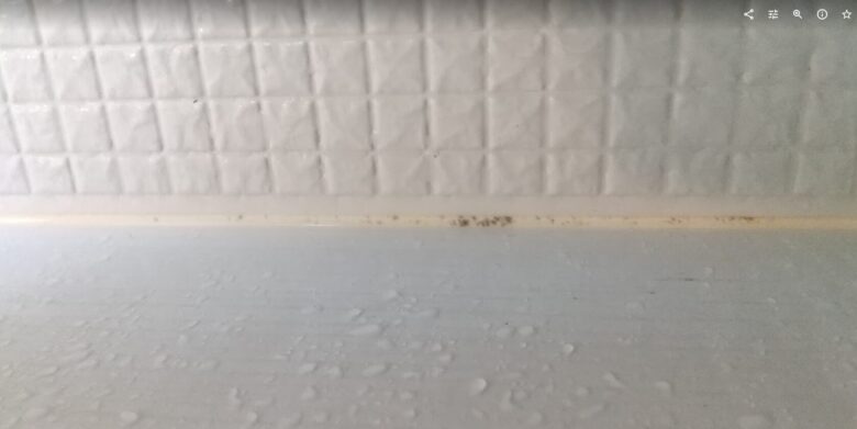 👇これはシャンプーなどを置くカウンターの端っこ、カビなのか何なのか汚い。