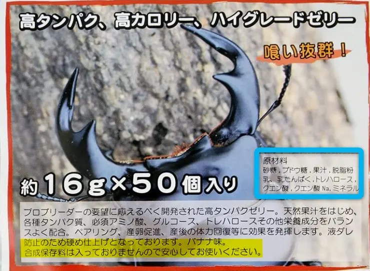 昆虫は甘い蜜を好む傾向があるので、基本的にブドウ糖果糖やトレハロースなどの糖分から作ったシロップが主原料になっているゼリーが多いよう