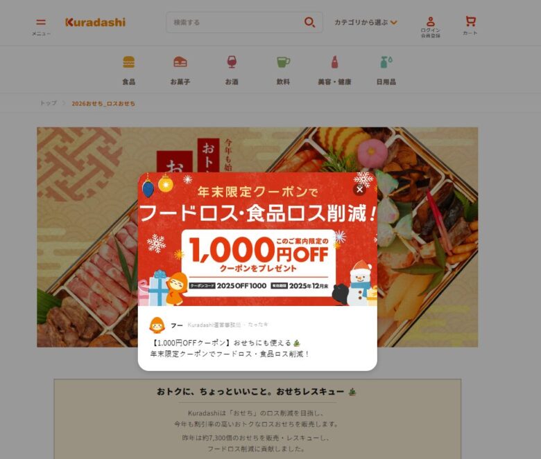 Kuradashiが販売する「ロスおせち」は、賞味期限が短くなったものや、余剰在庫となったおせちを特別価格で提供している商品です。