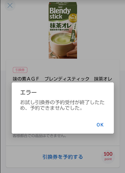 【ローソンお試し引換券】残りわずかとなっているのに「予約受付が終了したため予約できませんでした。」と出た。