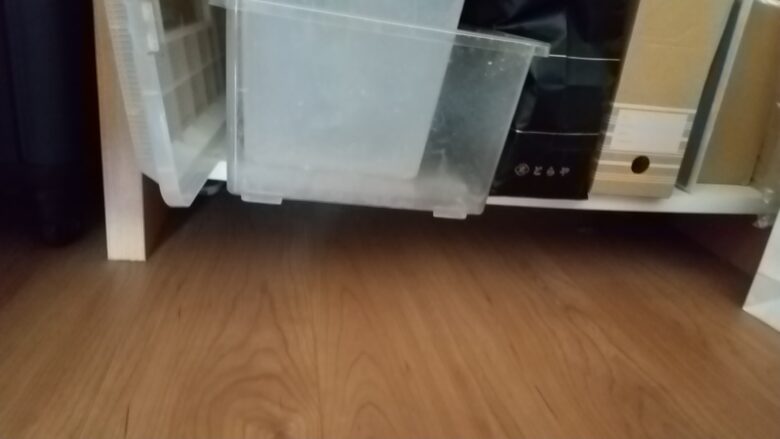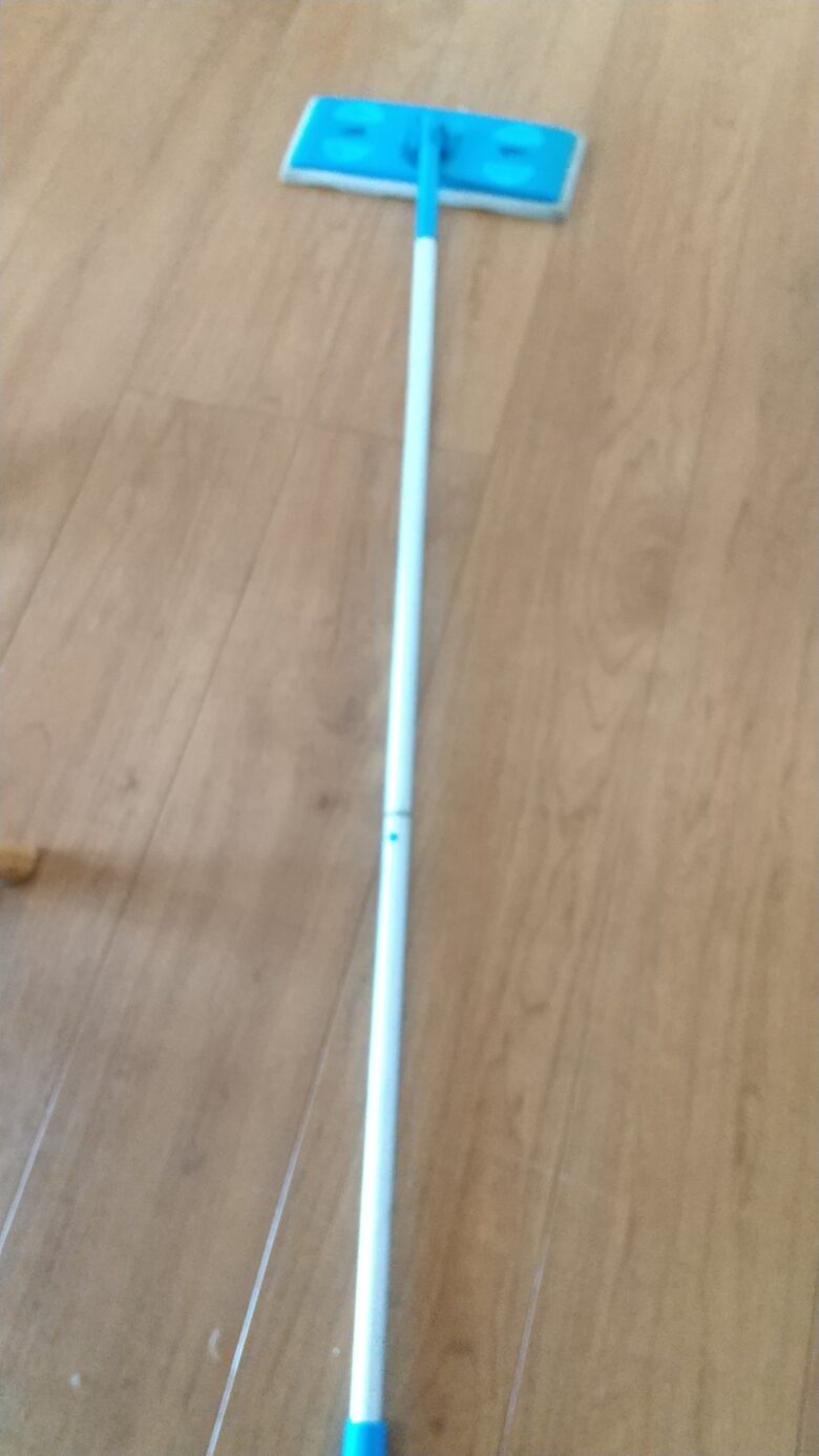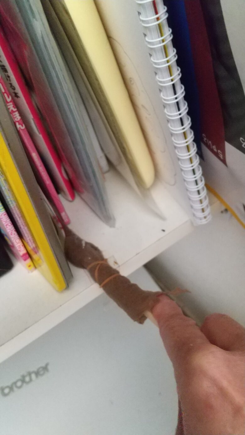まず、モップの木の棒は、そうですね、このような本棚の下とかやってみましょう。