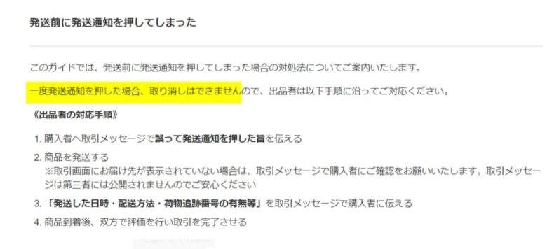 なお、メルカリ便では、一度発送通知を押してしまうと、取り消しは出来ません。