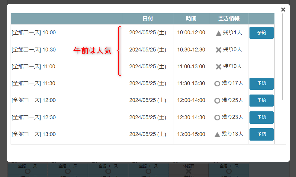 我が家が予約した時も2週間先でも、既に土日の午前中は満席でした。