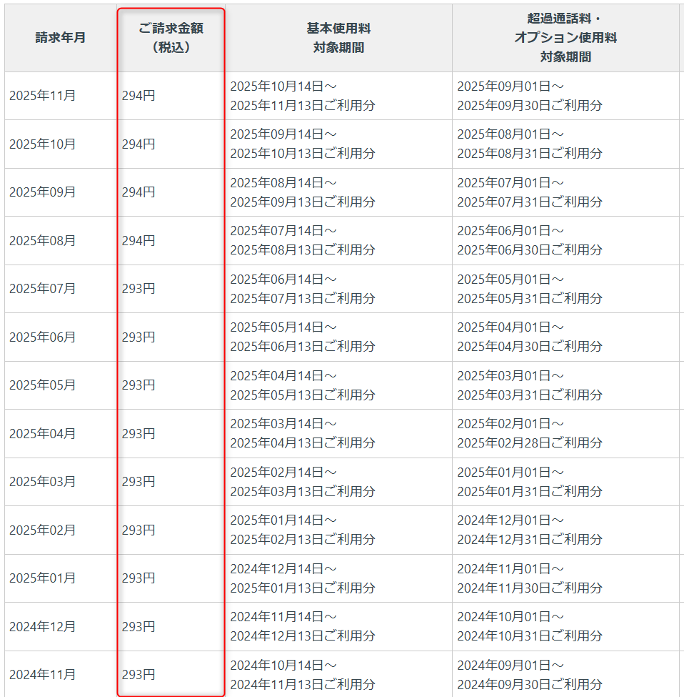 | 月額基本料(税込) | 290円~ | 119円~ |