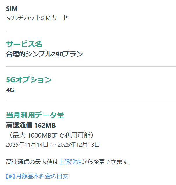 「合理的シンプル290プラン」なら上限設定を1GBにできるため、月額290円(1GBを超えた分は速度制限)で済みます。