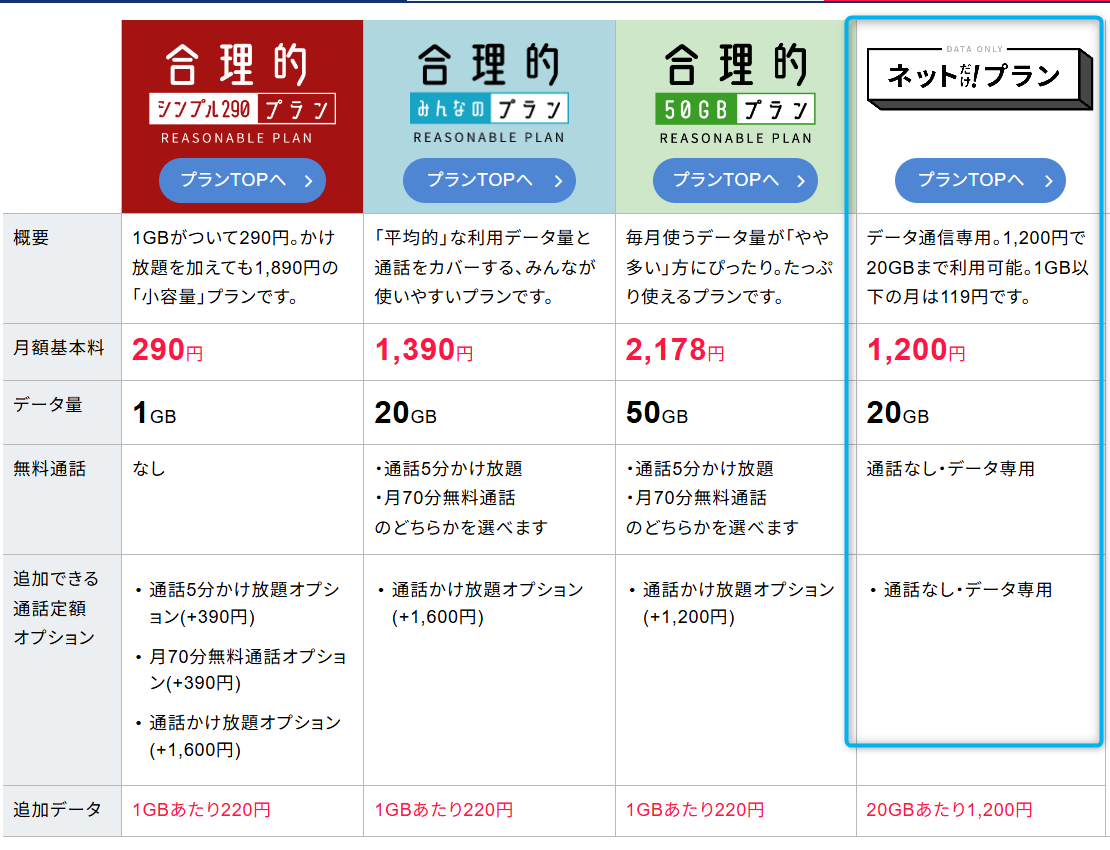 また、さらに安い、月々119円からの「ネットだけプラン」と「合理的シンプル290プラン」の違いを分かりやすく説明しているので、自分の子供にはどのプランが最適かが分かります。